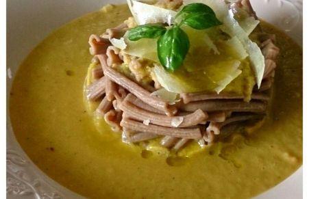Pasta su letto di smoothie melone e cocco