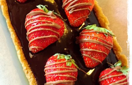 Crostata Gluten Free senza cottura con crema al cioccolato fondente e fragole fresche cioccolatose