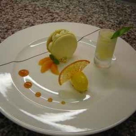 Macaron morbido al limone, granita alla vodka e arancia e sorbetto al mandarino