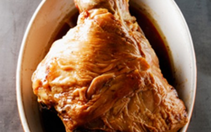 Alla fine della cottura, tirare fuori il cosciotto dalla pentola e servirlo tagliato a fette, accompagnato dal proprio sughetto di cottura filtrato.