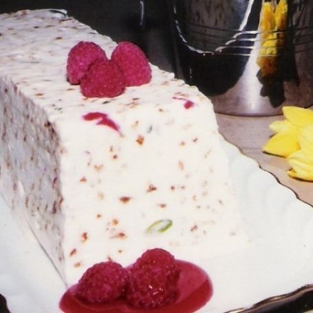 Sformare il torrone gelato su un piatto rettangolare, decorare a piacere e servire.