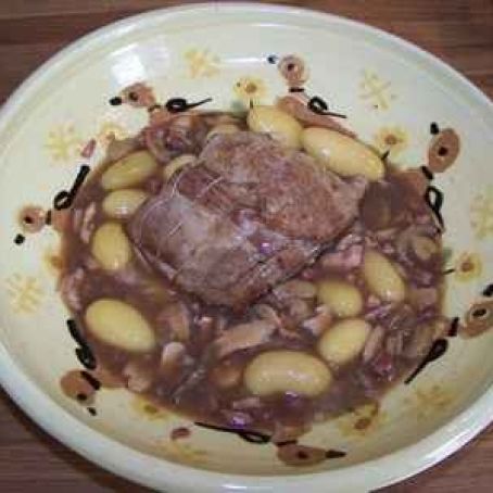 Rimettere nella pentola l'arrosto, la pancetta, le cipolle e i funghi.