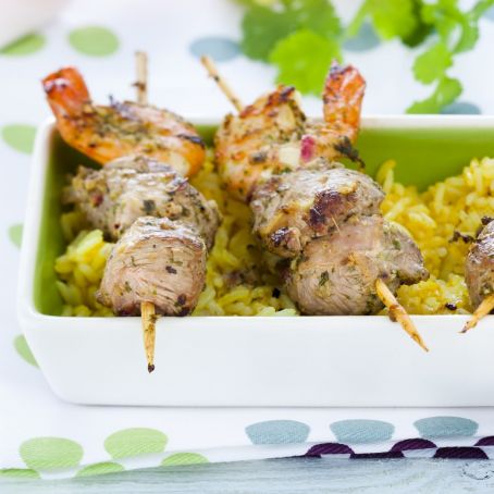 Servire gli spiedini di agnello ai gamberi accompagnati da riso allo zafferano.