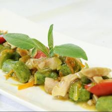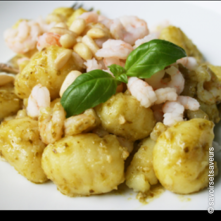 Gnocchi al pesto, gamberetti e pinoli