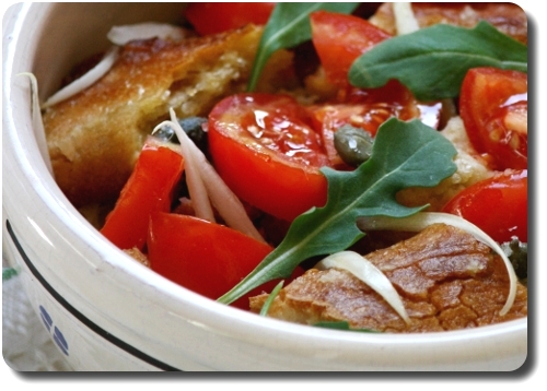 Una saporitissima insalata tipica della cucina povera salentina, ideale per recuperare il pane secco e ideale come piatto estivo. La mia variante è l'aggiunta della rughetta, dei capperi e dell'origano che rendono ancora più saporito il tutto.