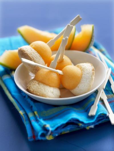 Inserire uno stuzzicadenti all'interno della pallina di melone e successivamente nel biscotto al cocco.