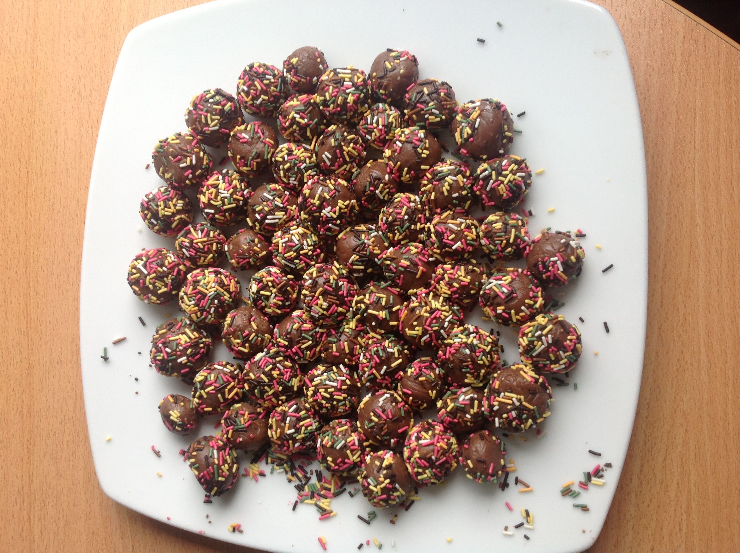 Creare delle palline con le mani e passarle nelle codette di cioccolato.