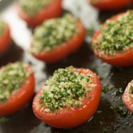 Togliere i pomodori dal forno e distribuire il pangrattato condito all'interno dei pomodori.