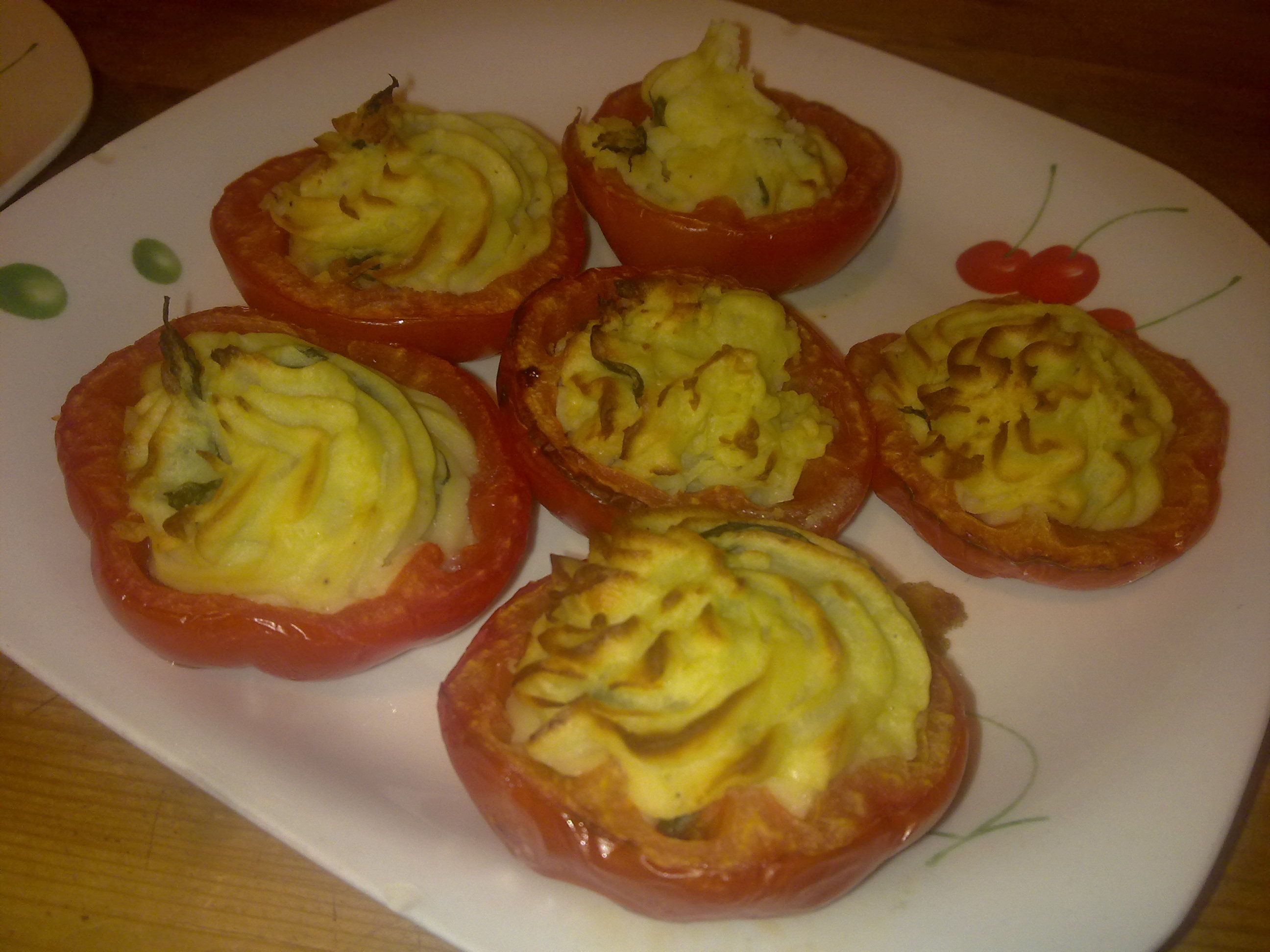 Asciugare l’interno dei pomodori con un foglio doppio di carta assorbente da cucina e riempirli con il composto preparato, fatto scendere da una tasca da pasticciere munita di bocchetta seghettata.