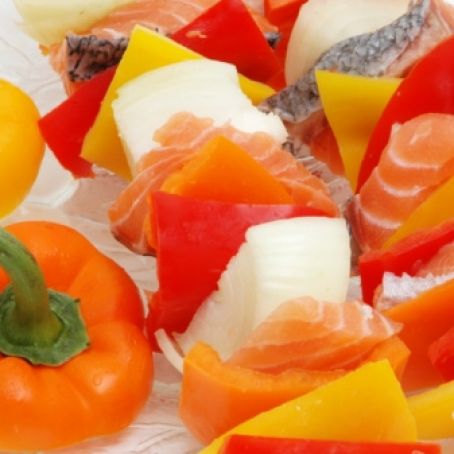 Comporre gli spiedini, alternando i peperoni, la cipolla e il salmone.