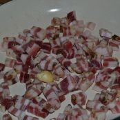 Prendete un padellino e mettete a soffriggere l’olio, l’aglio e la pancetta tagliata a cubetti.