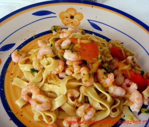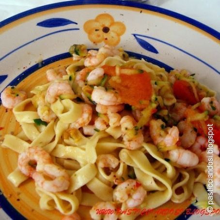 Con l'ausilio della macchina per la pasta (credo che sia presente in tutte le case degli appassionati di cucina, anche se nessuno ci vieta di fare questo passaggio a mano, come facevano le nostre nonne) ricaviamo delle sfoglie piuttosto sottili, infariniamole con farina, con semolino di riso o anche con della semola e facciamo le tagliatelle. Lasciamole quindi asciugare su di un piano infarinato.Nel frattempo prepariamo il condimento: passiamo per un paio di minuti i gamberi ormai scongelati in acqua bollente, laviamo e tagliamo a fiammifero le zucchine, prepariamo un soffritto con olio e aglio tritato. Soffriggiamo per un paio di minuti, aggiungiamo i pomodori freschi, tagliati a spicchi (per togliere la buccia è bene far sbollentare per qualche minuto);