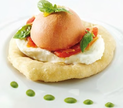 Pizza fritta con bufala campana, bavarese di pomodorini confit e salsa di basilico.