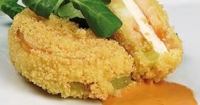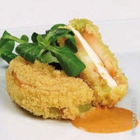 Posiziona la mozzarella al centro tra due fette di pomodoro e passa nella farina, nelle uova e nel cuscus sgranato.