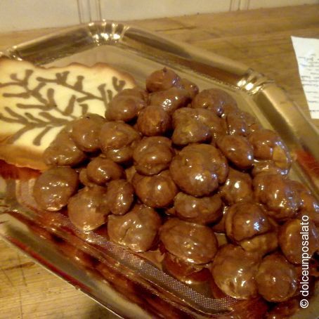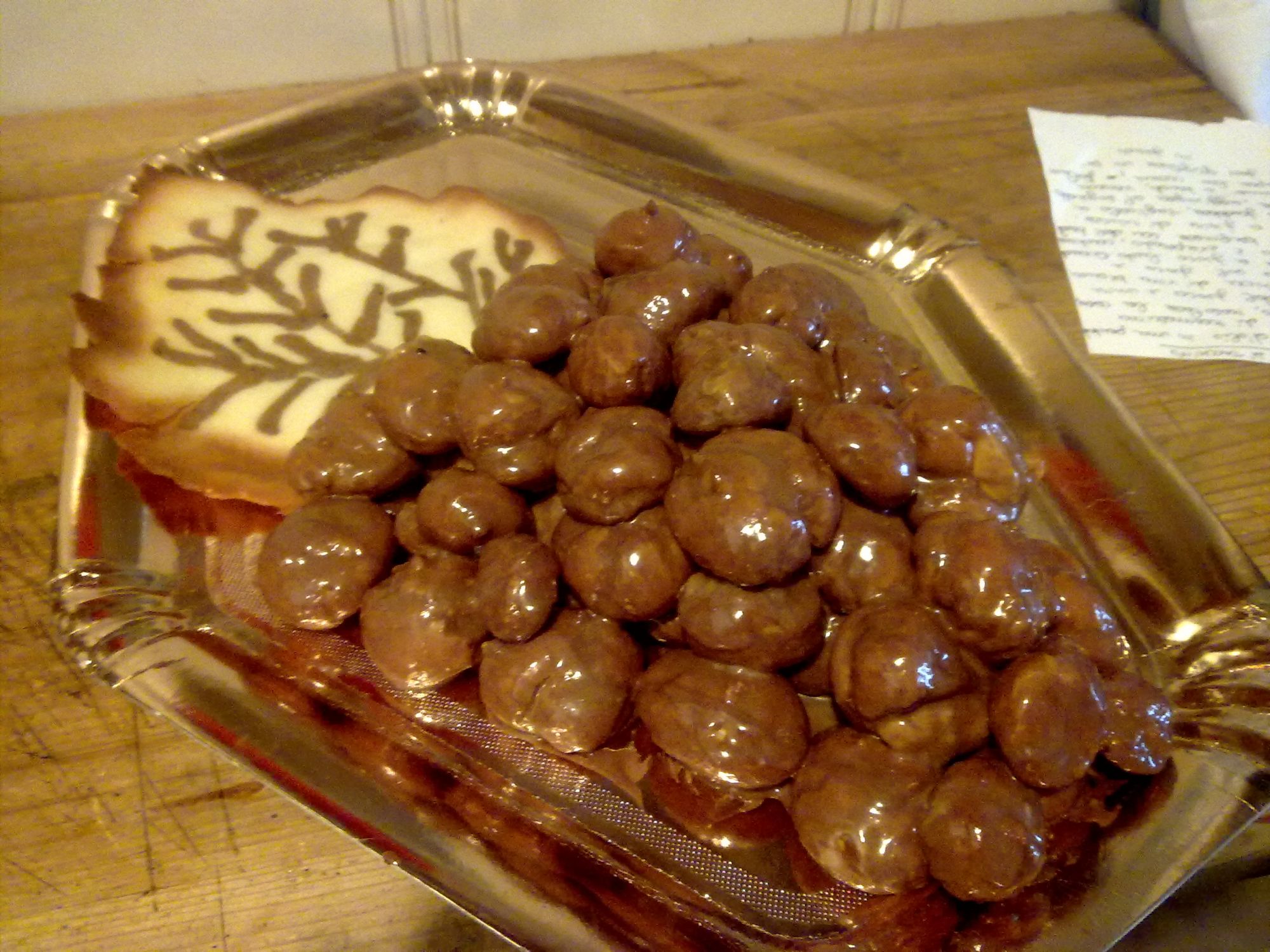 Immergere i bignè nella crema di cioccolato e, aiutandosi con due forchette, prelevarli e metterli su una gratella per dolci lasciandoli sgocciolare e asciugare leggermente.