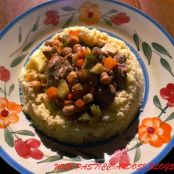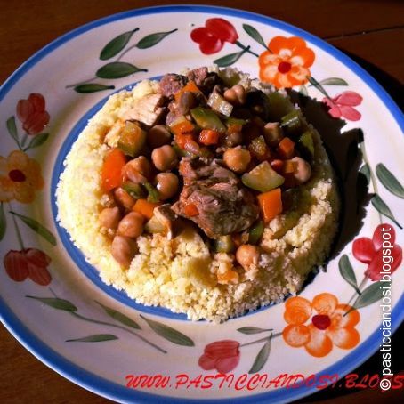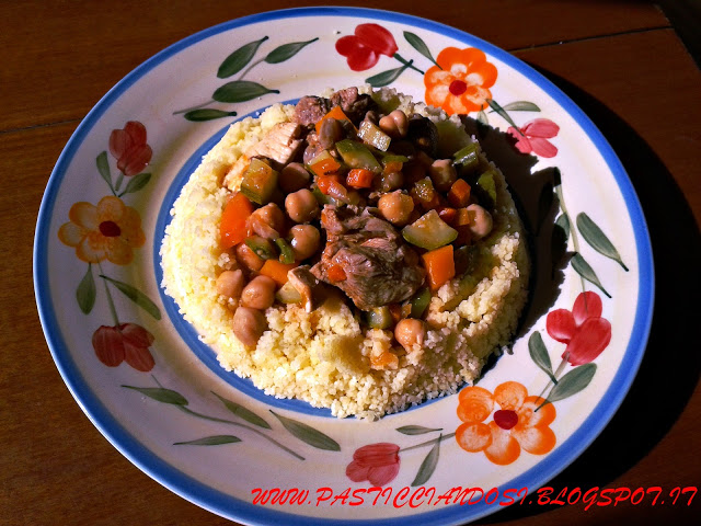 Su un piatto adagimao il couscous, versando prima un pochino di fondo di cottura, quindi la carne con le verdure, il gioco è fatto.