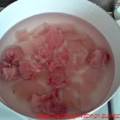 In un tegame, porre il petto di pollo, tagliato a fettine e lo spezzatino, quindi ricoprire con acqua, salare e portare ad ebollizione.