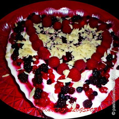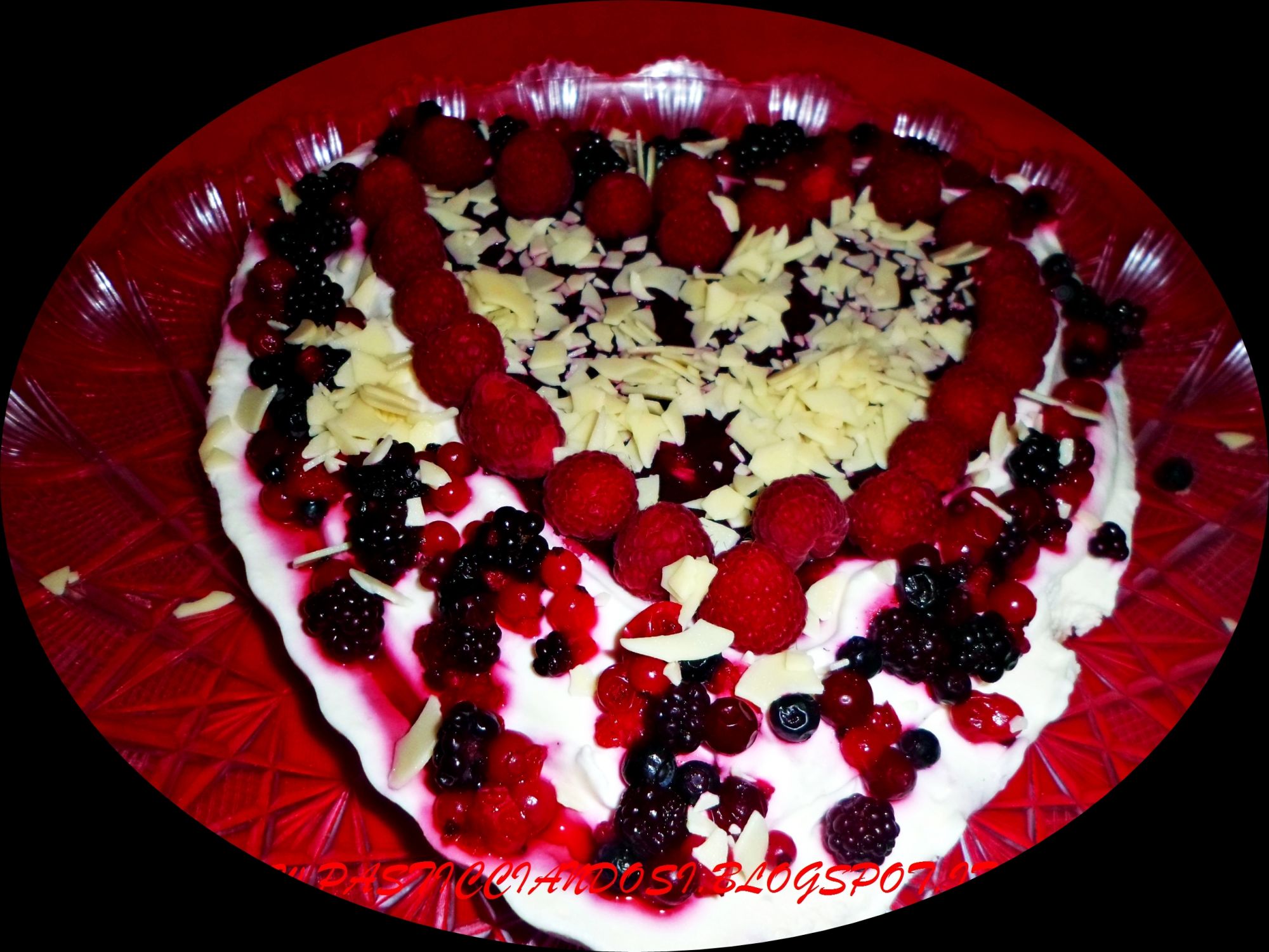 Passiamo in congelatore per almeno 1 ora; quando si sarà indurita estraiamo la torta dalla teglia, decoriamo con della frutta fresca e con delle scaglie di cioccolato bianco.