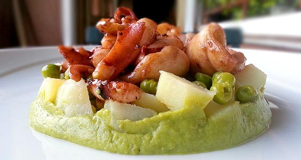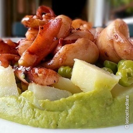 Questa sera volevo preparare un primo piatto a base di pesce; avevo degli splendidi totani ed ero intenzionata a cucinare un bel sughetto, poi, all’improvviso mi è venuto in mente che in freezer mi avanzava mezza confezione di piselli surgelati ed inoltre, sapendo che i legumi si sposano a meraviglia con i molluschi, ho pensato di tirar fuori la mia solita vena creativa e cominciare a sperimentare. Il risultato di questa ricetta a base di totani in crema di piselli è stato davvero esaltante, aiutato anche dai sapori un po’ sopra le righe dello zenzero e della glassa di aceto balsamico. Perfetto anche il contrasto tra la croccantezza dei totani e la morbidezza delle patate e della crema di piselli. Per farvela in breve, da provare assolutamente!