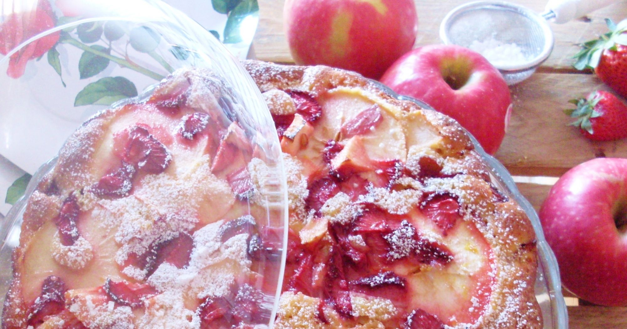 tagliare 2 mele a fette previa eliminazione torsolo, e 2 mele a cubetti insieme alle fragole,irrorarle di limone e mettere da parte montare le uova con lo zucchero aggiungere lo yogurt ed il burro ( o margarina ) fuso e freddo, aggiungere man mano la farina setacciata con il lievito e la scorza di limone . imburrare uno stampo versare metàimpasto e riempire con il cubetti di fragole e mele pink lady versare sopra il rimanente impasto e guarnire con le fette di mele e un o' di fragole e mele a cubetti.finire con i 2 cucchiai di zucchero di canna. infornare a 170° per 40 minuti.
