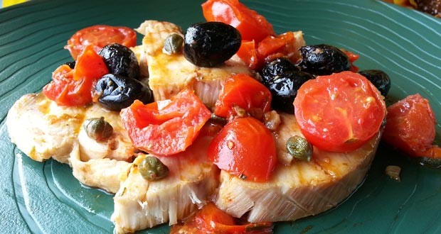 In una larga padella mettete l’olio e l’aglio e fate soffriggere leggermente. Aggiungete lo smeriglio e fatelo imbiondire su entrambi i lati. Una volta fatto, versate il vino e fate evaporare. Tagliate i pomodorini a metà ed aggiungeteli in padella insieme alle olive, ai capperi, all’origano al pepe. Se lo ritenete necessario, aggiustate di sale. Cuocete per altri 5 minuti ed il piatto è pronto