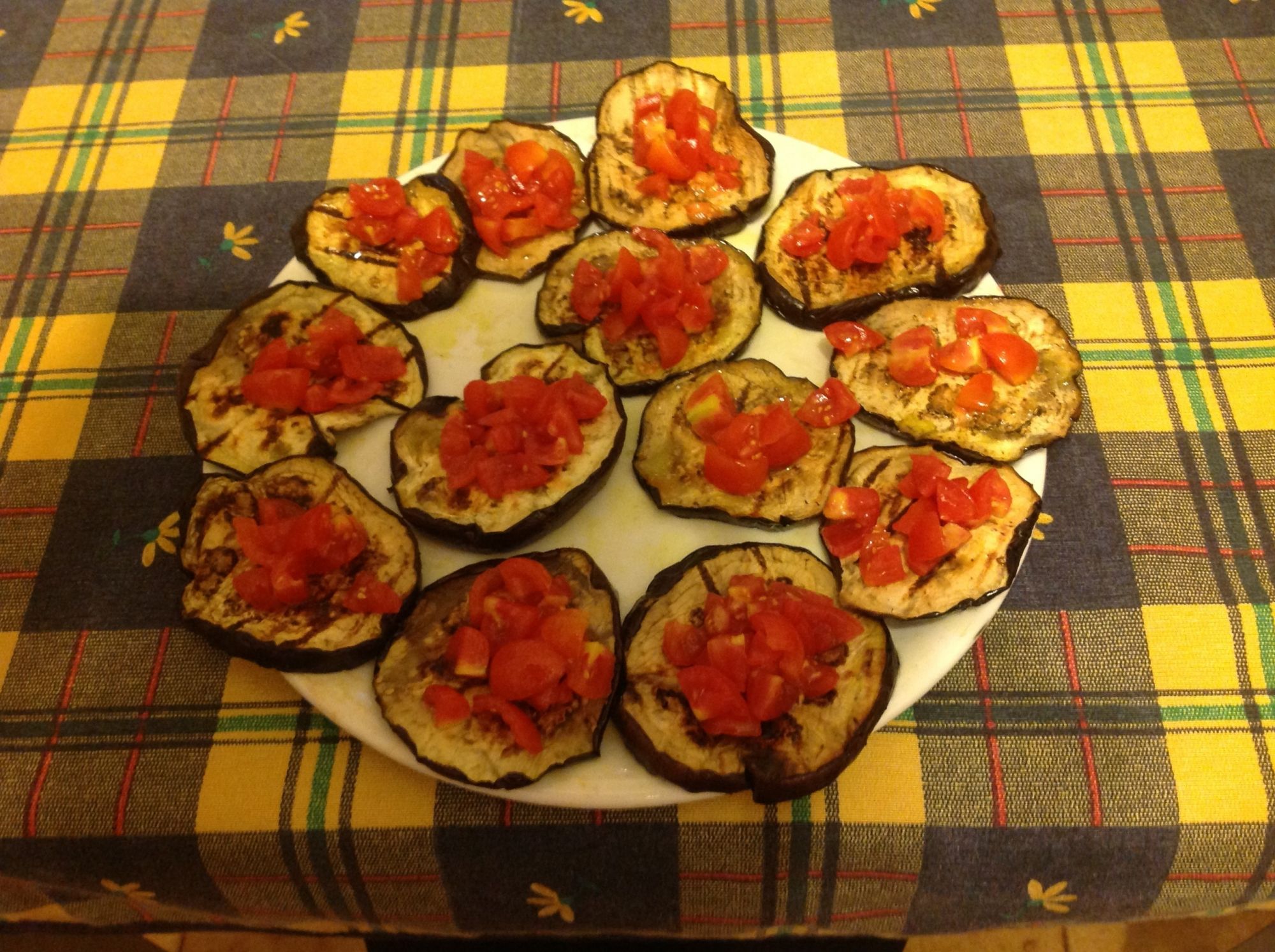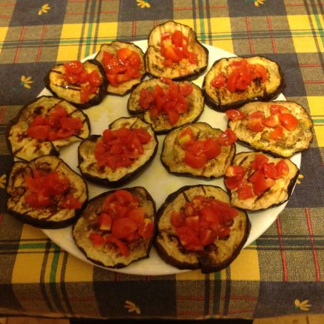 Dopo aver grigliate le melanzane, condirle con olio e sale e poi mettere sopra ogni fettina i pachino.