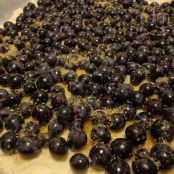 Quando la lievitazione è avvenuta posso stendere la pasta, possibilmente con le mani per non farle perdere la lievitazione, creando due sfoglie rettangolari abbastanza sottili. La prima la posiziono sulla teglia ricoperta con carta da forno, la cospargo con l'olio aromattizzato e sistemo l'uva cercando di essere generosa e attenta a riempire tutti gli spazi. Aggiungo tre cucchiai di zucchero sull'uva che serviranno per creare un sughetto delizioso che impregnerà tutta la pasta.
