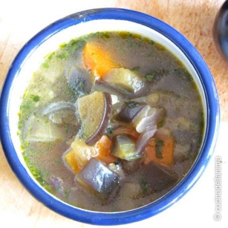 Affettate la cipolla, non troppo finemente e fatela stufare per qualche minuto con un cucchiaio di olio e uno di acqua. Tagliate le melanzane e la carota a dadini aggiungetela alla cipolla, unite il coriandolo (passato al mortaio) e il riso, fate insaporire, quindi aggiungete qualche cucchiaio di brodo e fate stufare per 15 minuti. Aggiungete i restante brodo e terminate la cottura. Aggiungete il prezzemolo, quindi lasciate raffreddare e servite.