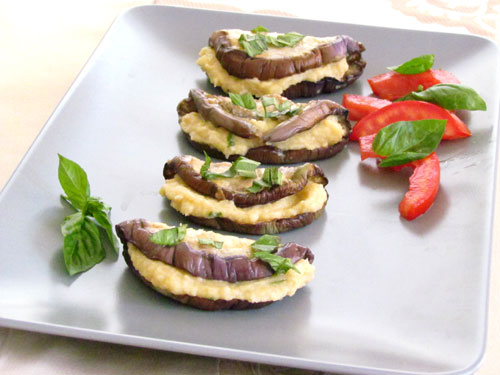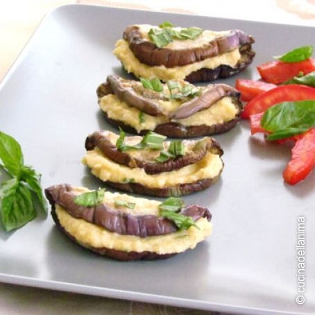 una ricetta per un antipasto a base di melanzane grigliate ripiene di salsa ai ceci e zucchine.