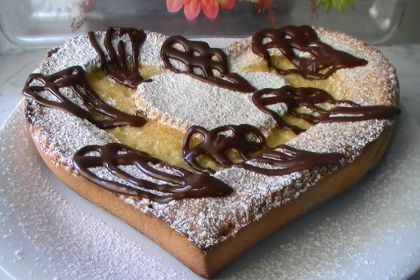 delle dita, incorporate le uova e il latte se necessario e formate un panetto liscio e omogeneo. Tenetelo in frigorifero fino all’utilizzo. Nel frattempo preparate la crema, in una casseruola lavorate la farina, lo zucchero e i rossi d’uovo con una frusta fino a far diventare il composto spumoso e gonfio. Travasate il latte e la scorza di un limone nel composto spumoso e mescolate, mettete la crema sul fuoco e sempre mescolando fatela cuocere adesso fino al bollore, appena la crema si addensa, toglietela dal fuoco, omettete la scorza del limone e aggiungete una vanillina e una noce di burro, mescolate e fate raffreddare. Trascorso il tempo indispensabile per tonificare la pasta stendete una parte alta ½ centimetro e sistematela in una teglia imburrata e infarinata, bucherellate il fondo e spalmate al suo interno la crema, stendete un’altra parte e formate un cuore oppure procedete formando le losanghe, con l’aiuto di una rotella dentellata ritagliate delle strisce di pasta, posizionate le strisce a griglia sulla crema e create il bordo della crostata. Infornate in forno già caldo a 180 gradi per circa 30 minuti, sfornate, spolverizzate e decorate con le forme di cioccolato.