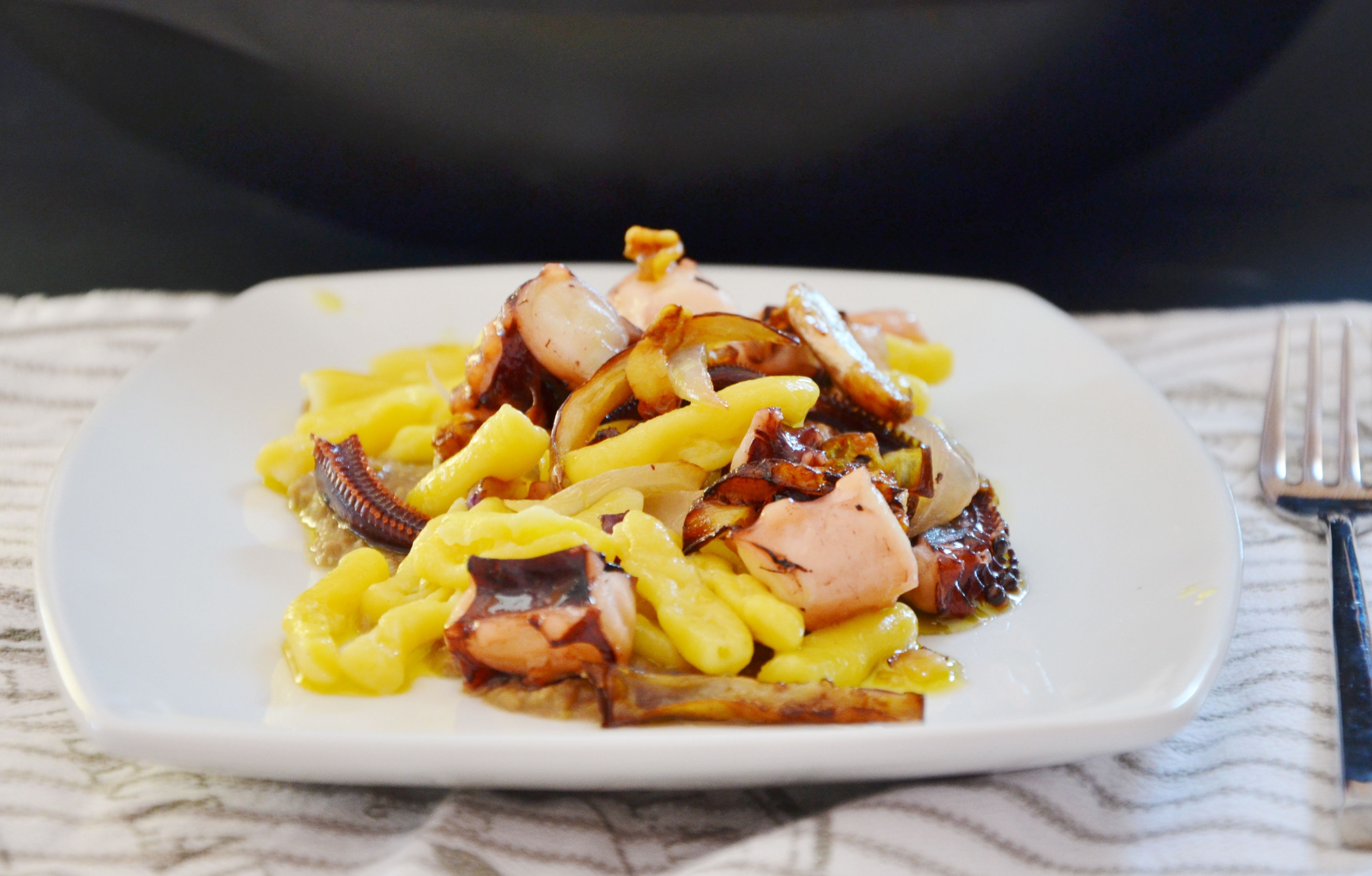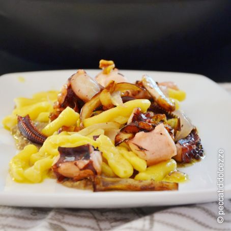 Cavatelli Gialli Polipo e melanzane su letto di lenticchie