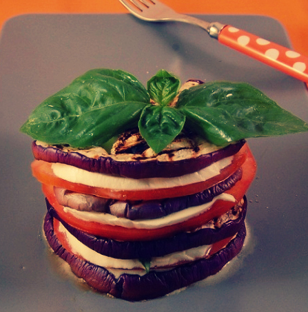 Tagliate i pomodori a fette di mezzo centimetro e salateli.Tagliate la mozzarella a fette di mezzo centimetro.Su un piatto da portata preparate la parmigiana di melanzane estiva alternando una fetta di melanzana, una di pomodoro, una fetta di mozzarella, del basilico spezzettato e un po’ di pepe.Continuate fino ad avere l’altezza desiderata e completate con una fetta di melanzana. Servite con un filo d’olio a crudo.