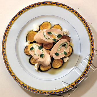 Tagliate 4 o 5 fette sottilissime di zucchina (circa g 20) e disponetele sulla fetta di tacchino, leggermente battuta e salata. Spalmate sulle zucchine g 20 di ricotta e arrotolate la carne, avvolgendola strettamente con carta da forno bagnata e strizzata. Cuocete l'involtino a vapore per circa 20 minuti. Nel frattempo tagliate a rondelle la zucchina rimasta, quindi saltatela in padella con l'olio e un pizzico di sale. Scartate l'involtino ormai cotto, tagliatelo in tre e appoggiatelo sulle zucchine Completate il piatto con foglioline di maggiorana fresca e con la ricotta avanzata.