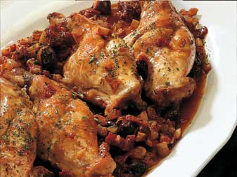 - 4 cosce di coniglio - una fetta di pancetta g 120 - pomodorini secchi g 70 - olive snocciolate g 30 - prezzemolo - 2 scalogni - brodo vegetale - olio d'oliva - sale - pepe