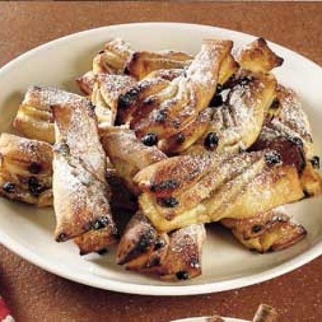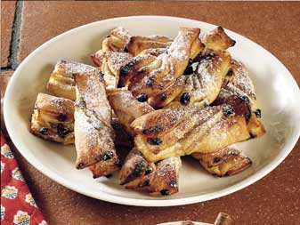 Fate scongelare la pasta sfoglia, quindi tiratela, con il matterello, in un rettangolo di mm 3 di spessore. Pareggiatelo, poi ritagliatelo lungo i bordi, in modo da dargli una forma regolare (cm 18 x 24): spalmatelo con la marmellata. Cospargete la pasta con l'uvetta non ammollata, quindi ripiegatela su se stessa per 3 volte partendo dal lato lungo, in modo da ottenere un nuovo rettangolo (cm 6 x 24), che taglierete in striscioline di cm 2 di larghezza (dovrete ottenerne 12). Attorcigliate ogni striscetta su se stessa poi sistematele tutte, allineandole un poco distanziate, su una placca imburrata. Cuocetele nel forno già a 200° per circa 20'. Sfornate le sfogliatine, sollevatele dalla placca con una spatola e disponetele su un piatto adeguato. Servitele leggermente tiepide, cosparse di zucchero a velo.