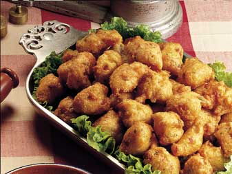 Lavate le patate e lessatele con la buccia, ponendole inizialmente in acqua fredda salata. Scolatele, pelatele e passatele allo schiacciapatate. In una casseruolina portate a bollore g 150 d'acqua con il burro e un pizzichino di sale. Unite quindi la farina tutta in una volta e, mescolando il composto, tenetelo sul fuoco fino a quando farà uno sfrigolio come se friggesse e si staccherà dai bordi e dal fondo della casseruola. Trasferitelo allora in un piatto e lasciatelo raffreddare. Preparate intanto un battuto con la pancetta, alcune foglioline di salvia e di rosmarino e mezzo spicchio d'aglio. Tritate le olive; riducete il prosciutto in dadolata. Mettete l'impasto freddo nella ciotola dell'impastatrice e, usando la frusta a gancio, lavoratelo a lungo incorporando uno alla volta le uova, non aggiungendo il successivo se il precedente non sarà stato amalgamato. Unite quindi le patate passate, il battuto di pancetta, il trito di olive, la dadolata.di prosciutto, un cucchiaino di lievito e una grattatina di noce moscata. Amalgamate bene. Riscaldate abbondante olio nella padella dei fritti e gettatevi l'impasto poco per volta, prendendolo a piccole cucchiaiate; si gonfierà durante la frittura. Via via che i tortelli saranno pronti, passateli a sgocciolare su un doppio foglio di carta assorbente da cucina, quindi sistemateli in un piatto da portata, oppure su un vassoio, e teneteli in caldo. Serviteli subito, appena terminato di friggere.
