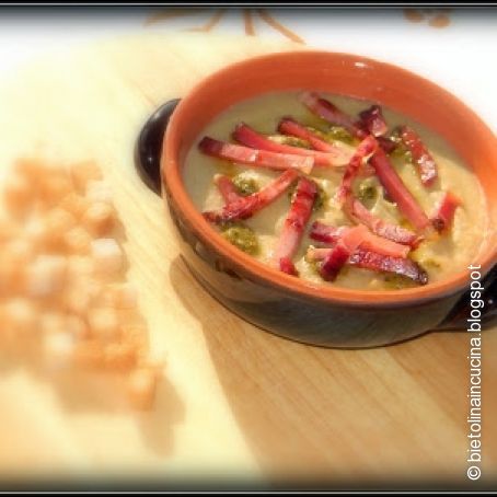 Una zuppetta semplice ma preparata con ingredienti che vengono un po' da tutt'Italia: a partire dalle melanzane maturate al sole del Sud, passando per la Liguria col suo gustoso Pesto Genovese arrivando fino all'Alto Adige per qualche tocchetto di speck!