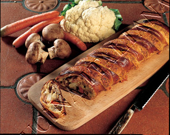 - pasta sfoglia surgelata g 400 - carote g 300 - cavolfiore g 250 - funghi "champignon" g 250 - fontina a fette g 150 - pancetta tesa, a fettine, g 50 - 2 scalogni - olio d'oliva - burro per la placca - uovo per pennellare - sale - pepe
