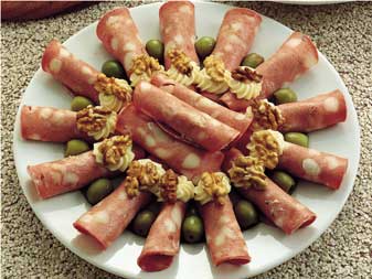 Passate i g 30 di noci al tritatutto elettrico e raccogliete il ricavato in una ciotola. Unite il gorgonzola, il mascarpone e mezza cucchiaiata di prezzemolo tritato. Mescolate amalgamando bene il composto che distribuirete in parti uguali tra le fettine di mortadella. Arrotolatele quindi a una a una, così da ottenere gli involtini che disporrete con garbo su un piatto adeguato. Completate la preparazione con una dozzina di olive, ciuffetti di maionese, noci
