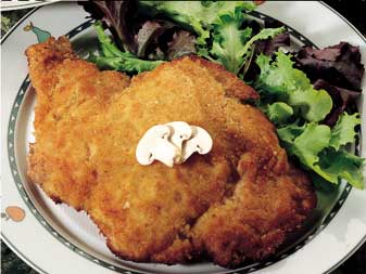 - 4 lombatine di vitello con l’osso, circa kg 1 - champignon g 300 - 4 fettine di prosciutto crudo g 100 - porcini secchi g 20 - farina - 2 uova - pangrattato - aglio - rosmarino - olio d’oliva - sale - pepe