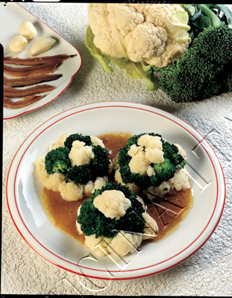 Lessate separatamente il cavolfiore e i broccoletti in acqua bollente leggermente salata. Scolateli, quindi disponeteli a cupoletta. Preparate la salsina per condire: diliscate e lavate con cura le acciughe e spezzettatele. Scaldate in una padella 3 cucchiaiate d'olio e gettatevi i pezzetti di pesce. Unite uno spicchio d'aglio tritato e un pezzetto (1/4) di dado. Irrorate con un mestolino di acqua bollente. Mescolate e cuocete finché le acciughe saranno completamente sfatte. Versate la salsa sulle verdure preparate (che dovranno essere ancora piuttosto calde) poi servitele immediatamente.