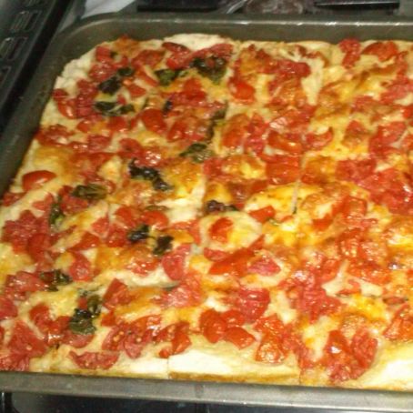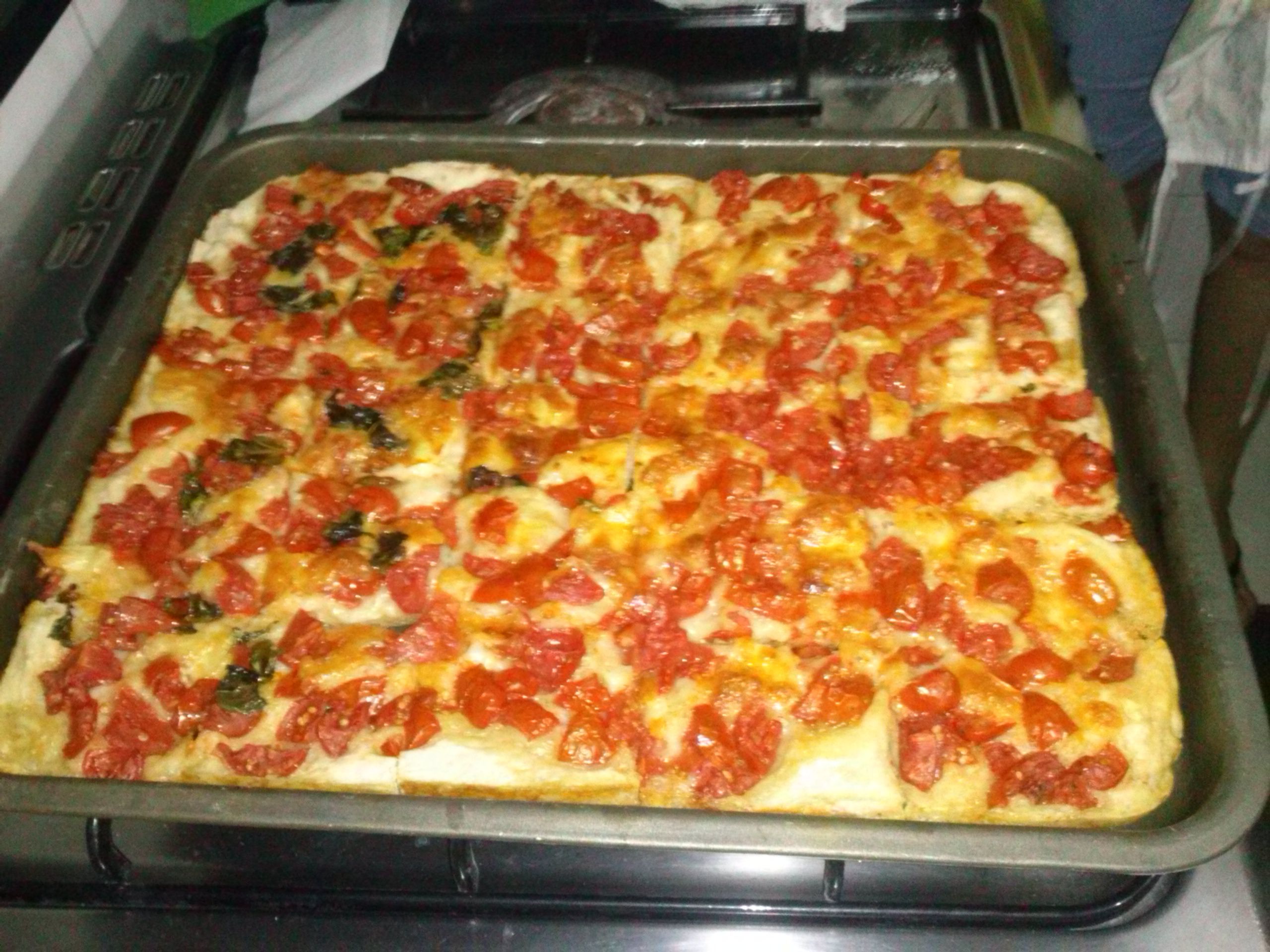 - tre bicchieri di acqua da 125 ml,3 cucchiai rasi di sale,un lievito di birra,circa 700 g di farina,circa mezzo chilo di pomodorini,aglio,basilico,un quarto di mozzarella,origano q.b