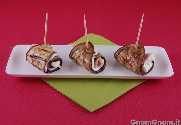 Tagliate le melanzane a fette spesse circa mezzo centimetro.Arrostitele su una piastra calda, a fiamma media, 4-5 minuti per lato.E fatele raffreddare.Salate le melanzane, mettete una striscia di prosciutto cotto, spalmate un po’ di formaggio fresco (senza esagerare, altrimenti quando arrotolate rischiate di far uscire tutto fuori) e pepate.