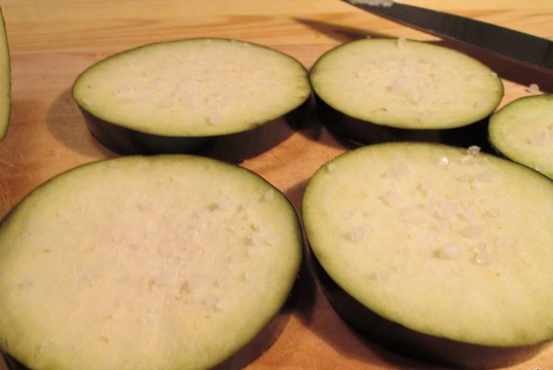 Prendere le melanzane, tagliarla a fette di 8 mm e disporle in una pirofila una vicino all'altra e salarle tutte.