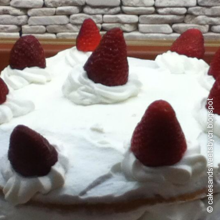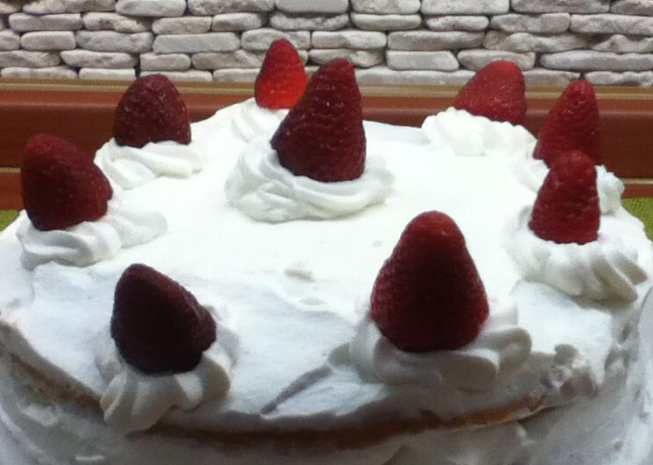 Una volta pronto il pan di spagna lo tagliamo in due parti e lo farciamo con la panna e pezzetti di fragole.