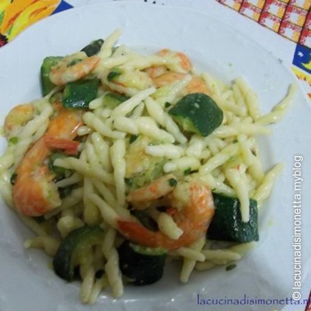 Fate cuocere a fuoco lento e versate 1/2 bicchiere di vino bianco, continuate la cottura a fuoco lento. Nel frattempo mettete a bollire l'acqua per la pasta, versate le trofie e lasciatele cuocere. Quando la pasta sarà cotta scolatela e saltatela in padella con le zucchine ed i gamberetti. Le trofie con zucchine e gamberetti sono pronte per essere servite.