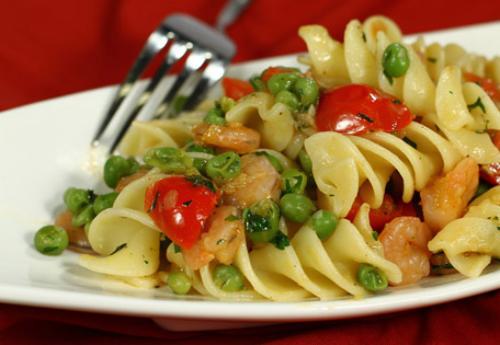 Fusilloni gamberetti, piselli e pomodorini