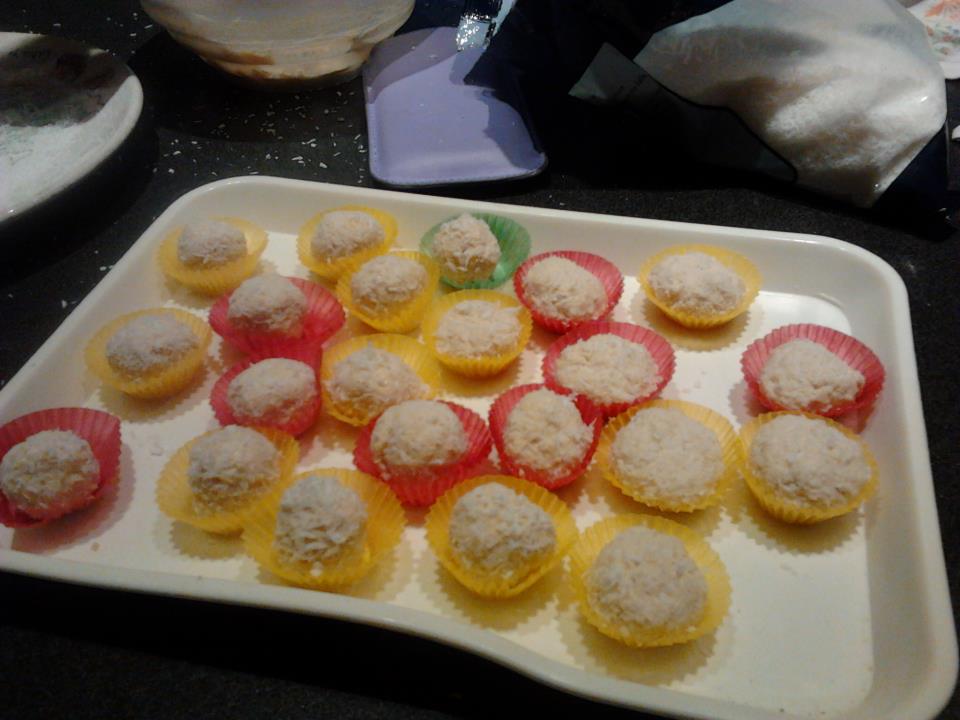 Componete tante piccole palline e rotolatele bene nella farina di cocco; ponetele in dei pirottini su un vassoio e lasciate freddare fino al momento di servirle.