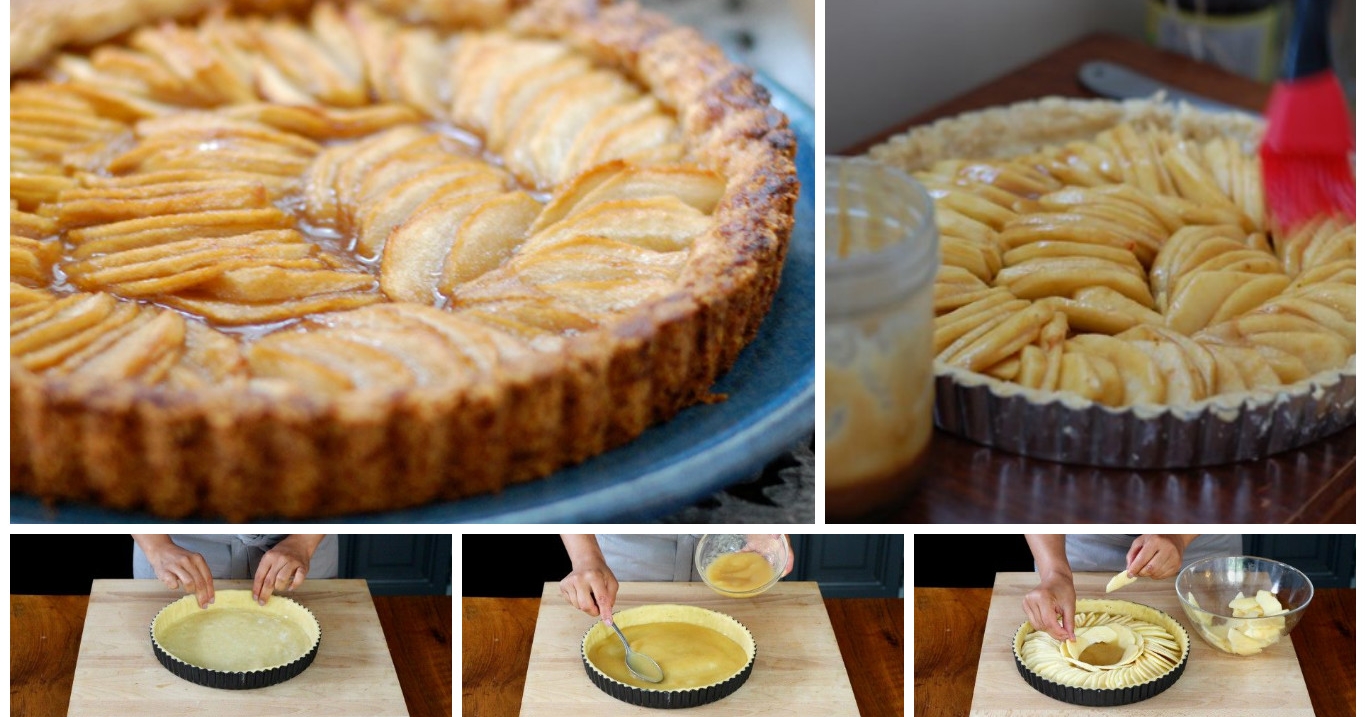 Usare una teglia per crostata, imburrare,versare all'interno il composto e guarnire con fettine sottili di mela con la buccia.