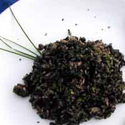 Pulire le seppie, togliere il sacchetto contenente il nero e conservarlo, lavarle e tagliarle a listarelle.